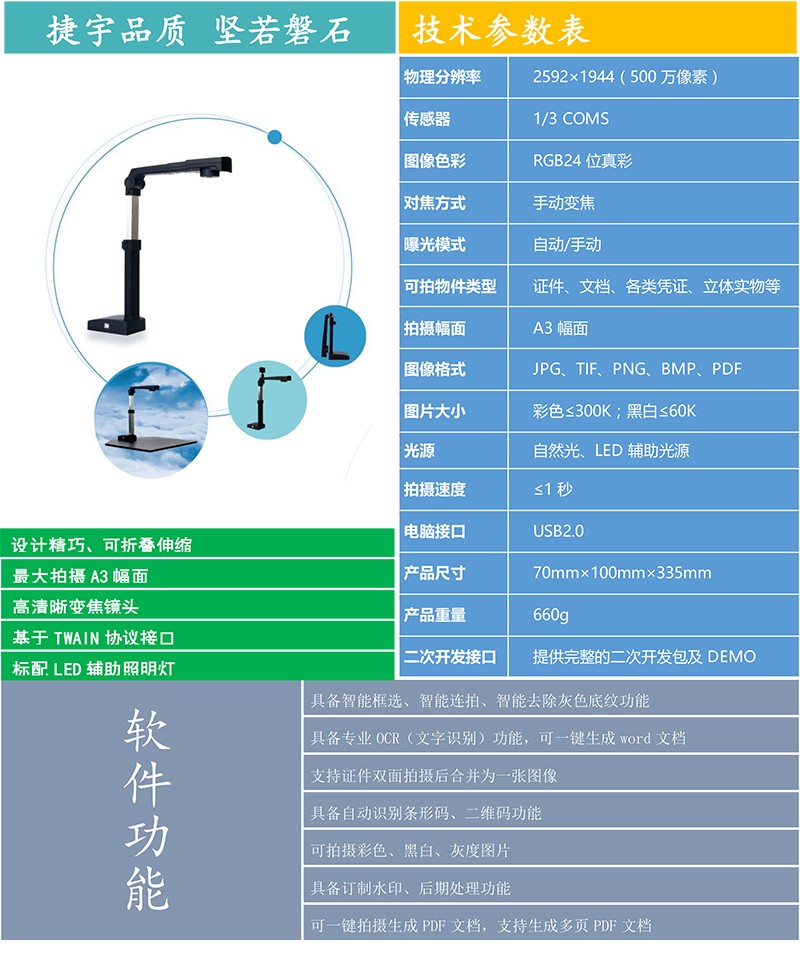 “捷宇”品牌的高拍儀產(chǎn)品可以完全取代傳統(tǒng)平板掃描儀,除了在各項(xiàng)性能指標(biāo)上優(yōu)于傳統(tǒng)掃描儀之外,更具備了體積小、無機(jī)械損耗、不用外接電源等傳統(tǒng)掃描儀無法實(shí)現(xiàn)的優(yōu)點(diǎn)!