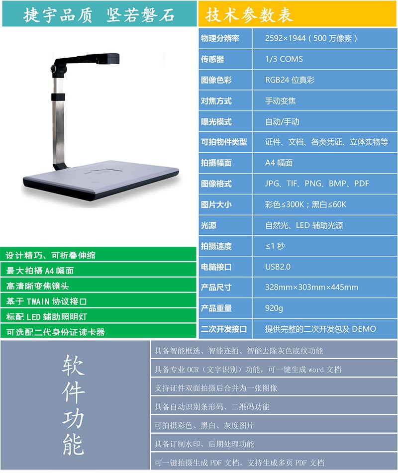“捷宇”品牌的高拍儀產(chǎn)品可以完全取代傳統(tǒng)平板掃描儀,除了在各項(xiàng)性能指標(biāo)上優(yōu)于傳統(tǒng)掃描儀之外,更具備了體積小、無機(jī)械損耗、不用外接電源等傳統(tǒng)掃描儀無法實(shí)現(xiàn)的優(yōu)點(diǎn)!