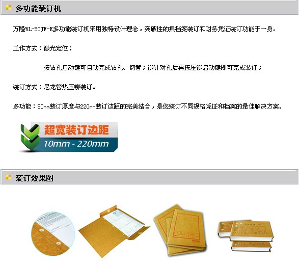 1、多功能:萬隆藍(lán)寶WL-50JF-E多用途裝訂機(jī)采用獨(dú)特設(shè)計(jì)理念,突破性地集檔案裝訂和財(cái)務(wù)憑證裝訂功能于一身。