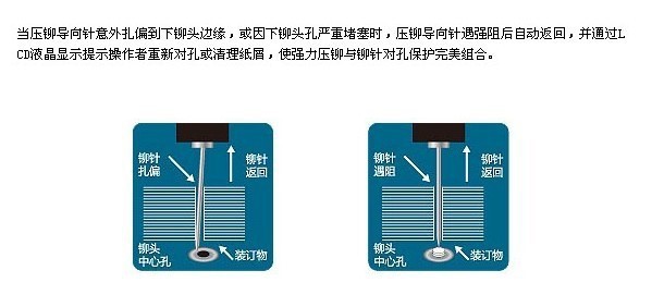 5、獨(dú)創(chuàng)的壓鉚保護(hù)系統(tǒng)(專利):強(qiáng)力壓鉚機(jī)構(gòu),緊固的壓鉚效果,但當(dāng)特殊意外壓鉚針扎偏到下鉚頭邊緣,或因裝訂物未鉆透嚴(yán)重堵塞下鉚頭孔時(shí)鉚針自動(dòng)返回,并通過LCD液晶顯示提示操作者重新對(duì)孔或清理紙屑。全面消除了壓鉚機(jī)構(gòu)的損壞。解決了壓鉚機(jī)構(gòu)保護(hù)的瓶頸問題。屬國內(nèi)首創(chuàng)。