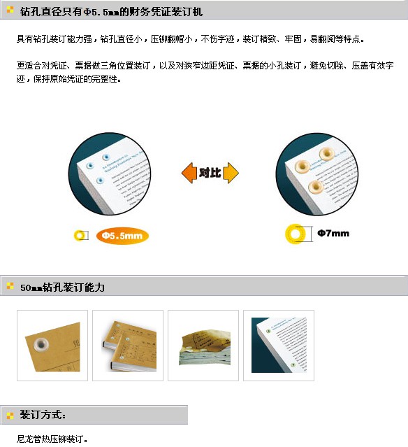 具有鉆孔裝訂能力強(qiáng),鉆孔直徑小,壓鉚翻帽小,不傷字跡,裝訂精致、牢固,易翻閱等特點(diǎn)。